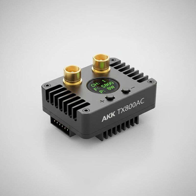 The AKK TX8000AC is a professional FPV video transmitter featuring 5.8GHz frequency, 8W power, and 96 channels, ideal for stable long-range FPV flights with minimal signal interference.